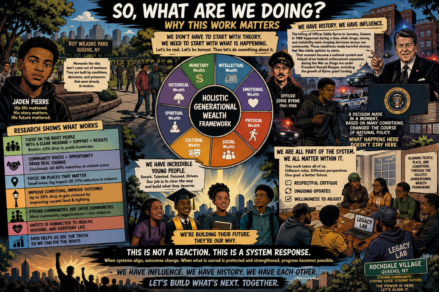 This work is not a reaction. It is a system response. It looks at people, place, and conditions together. It uses data to understand what is happening and aligns the full Holistic Generational Wealth framework to respond to it.